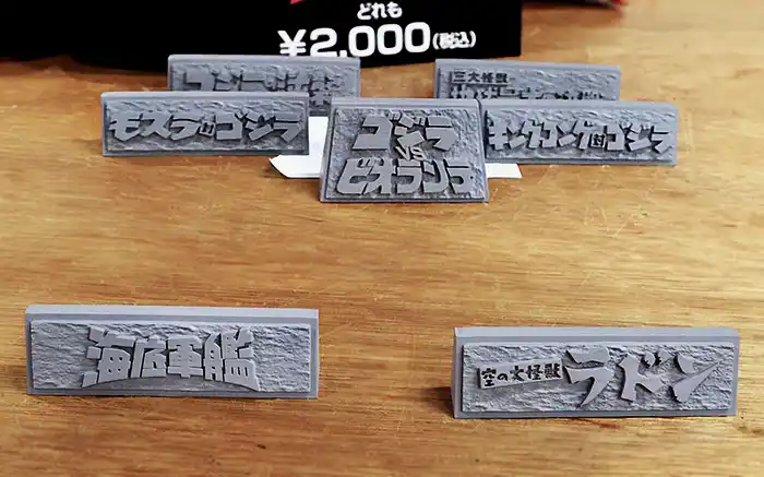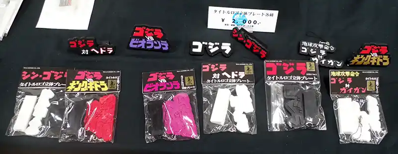 | ビルの最新作「デストロイア飛翔体」が中央に並んだテーブル。 その横では杉田氏近作の飛びジェットジャガーと、ねこだまし氏のタイトルロゴ立体プレート6種も展示・販売されました。 | |